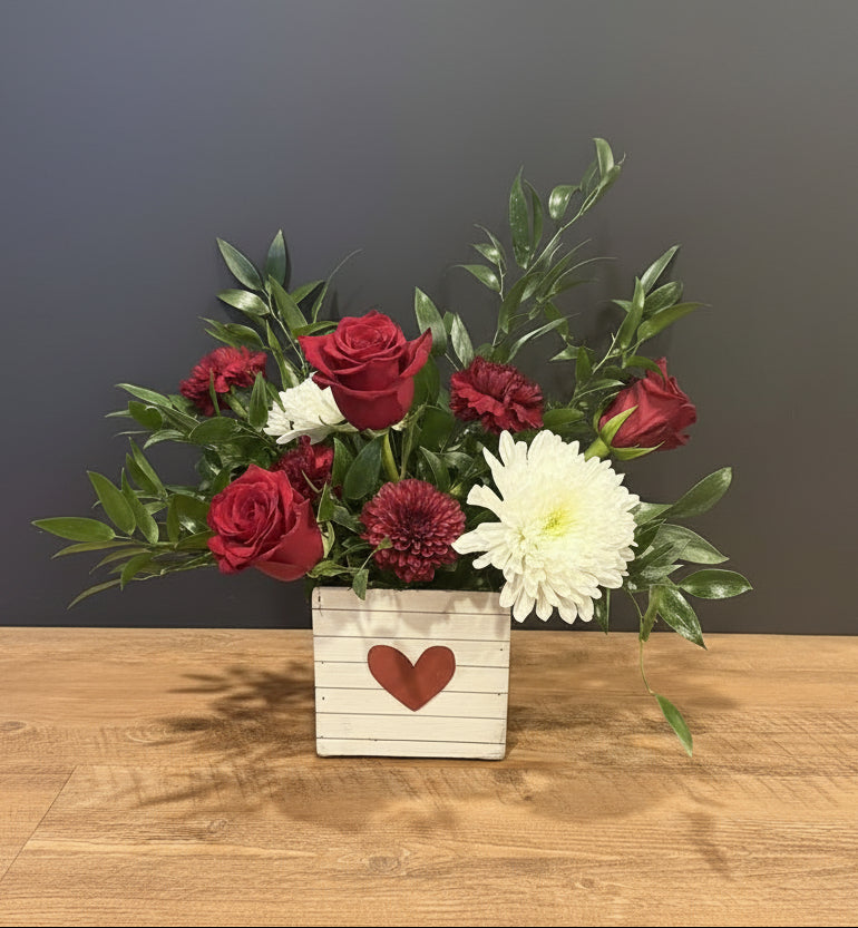 Valentine assorted fresh flowers in a wooden rustic heart box.