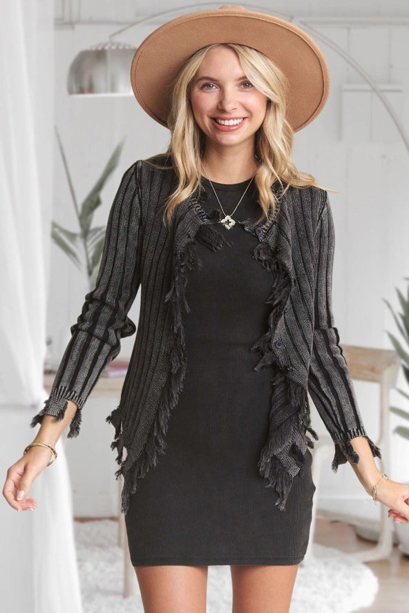 BUTTON DOWN MINERAL WASHED SWEATER TOP WITH DISTRESSED EDGE