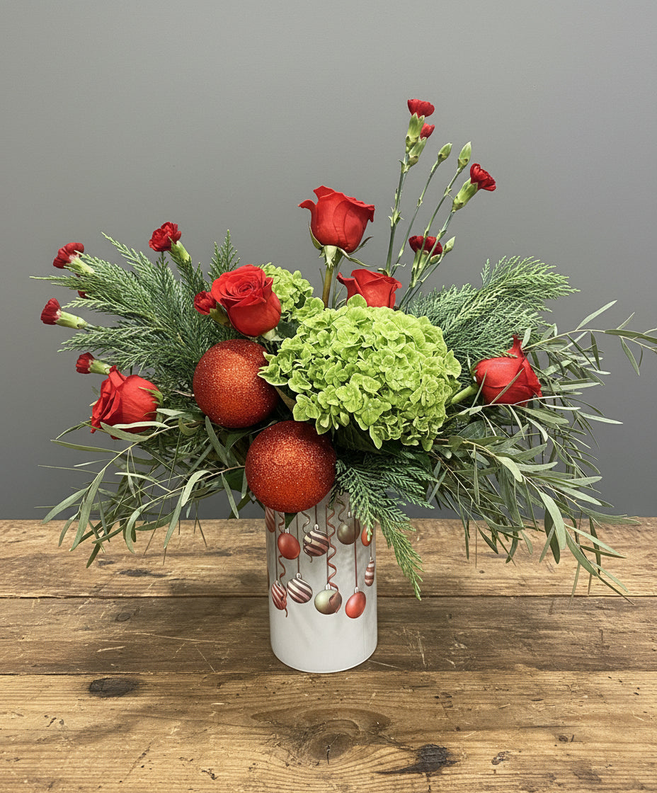 Winter greenery mix with seasonal colored flowers & ornament accents in a frosted ornament vase.