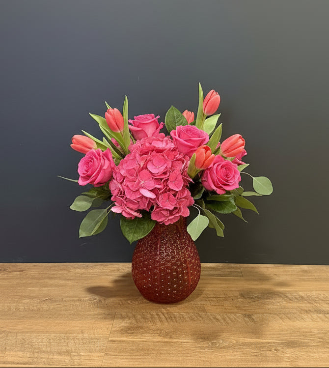 Assorted Pink Flowers in a Large Dimpled Pink Vase.