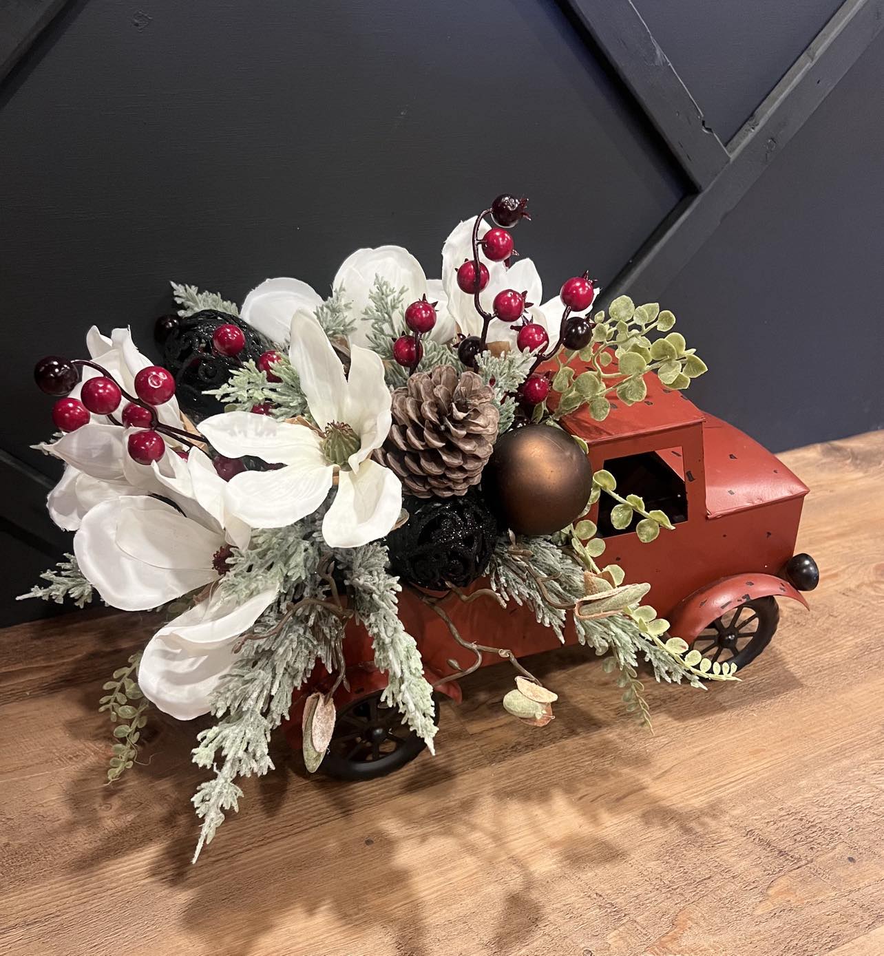 Metal Vintage Truck filled with Seasonal Silk Artificial Flowers, Ornaments & Pine Cones.