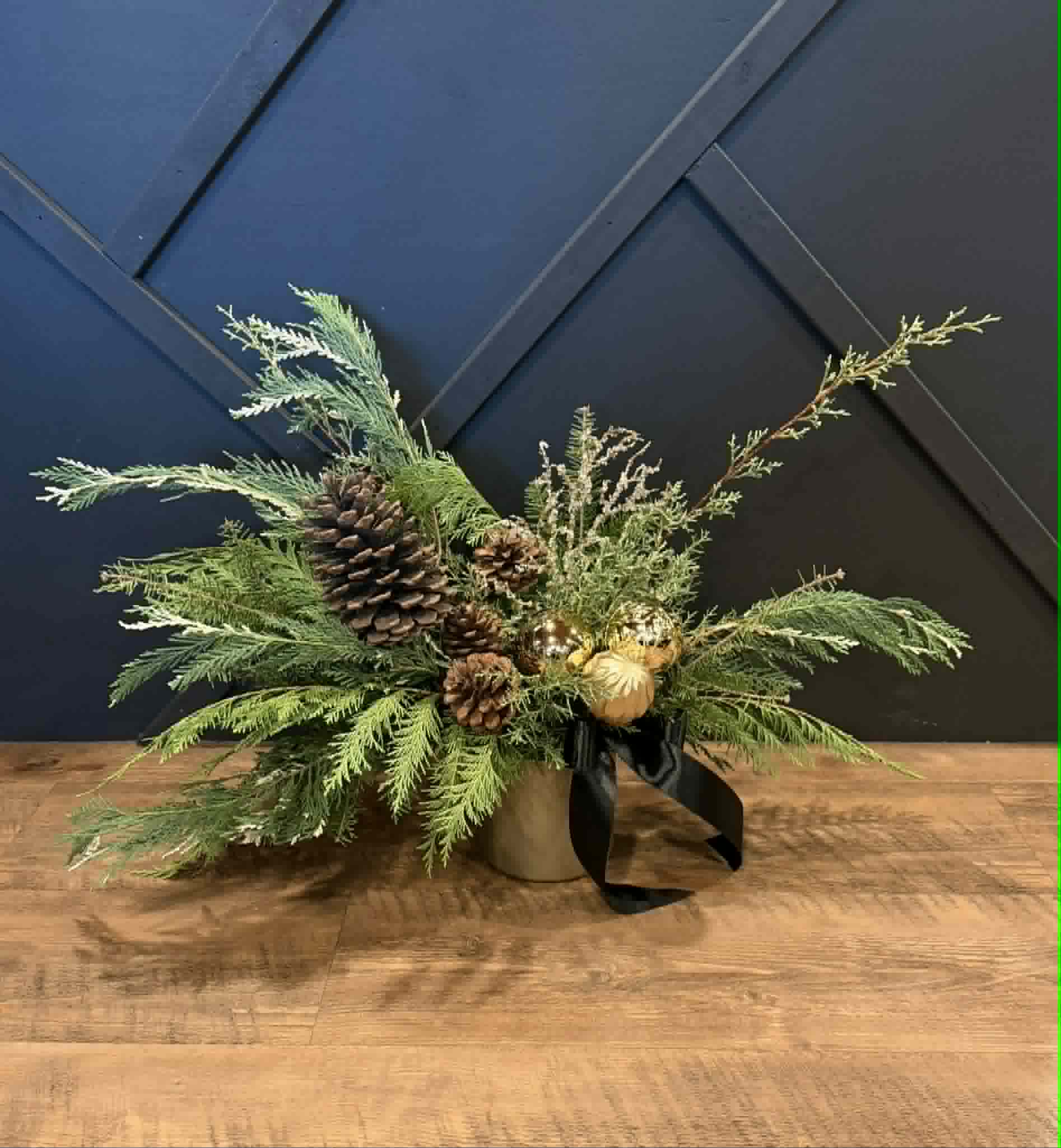 Assorted winter greenery in a ceramic matte gold container with pine cones, ornaments & ribbon.